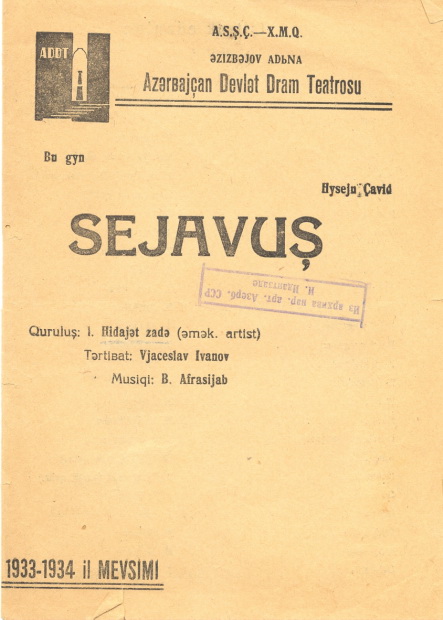H. Cavid “ Səyavuş ”. Azərbaycan Dövlət Dram Teatrı. 1932 – 33 – cü il mövsümü. İnv N 2550